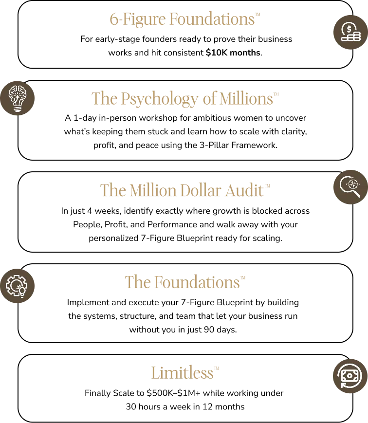 A 1-day in-person workshop for ambitious women to uncover what’s keeping them stuck and learn how to scale with clarity, profit, and peace using the 3-Pillar Framework.