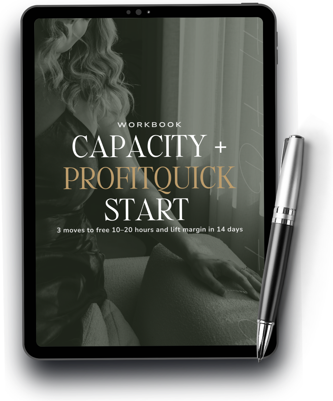 Capacity + Profit Quickstart, the no-BS workbook with 3-pillar moves that cut your hours and stop profit leaks.