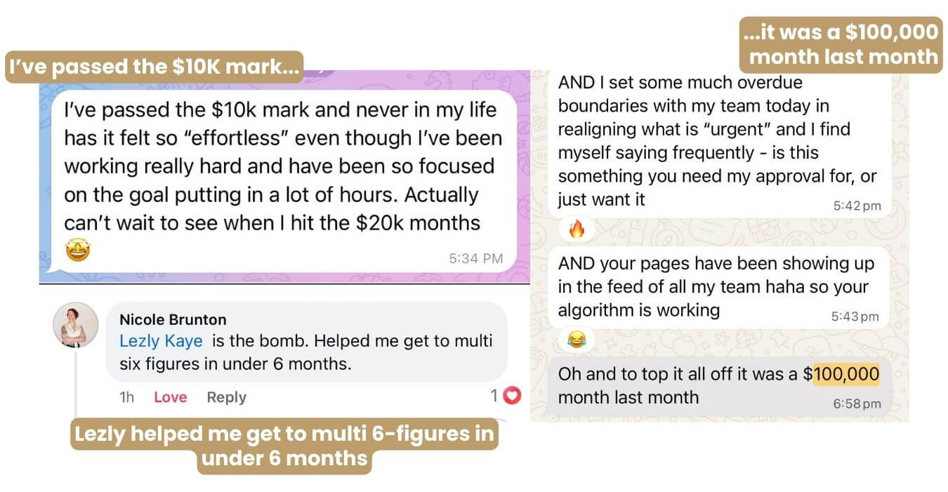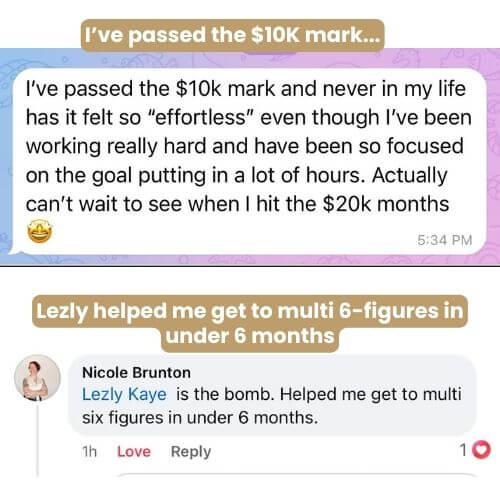 "In the last 9 months that we've been working with Lezly Kaye, that has been some major shifts in my life. The amount of moves that have happened in my life since started working with Lezly has been phenomenal. When I started with Lezly, I dropped down from full-time leadership role to casual to focus my business. There has been several pivot in my business since working with her... it felt very edgy, I felt lack, I was losing control. However, having Lezly there to be able to guide through and support through those edges has helped push me... to be able to now run a multi 6-figure business..."